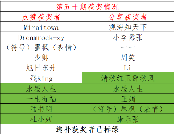 在每个周一,将同时公布本个周期七天(上周二至本周一)每天的点“赞”前10名、“分享”前10名,把本星期一上榜人员与上星期一上榜人员进行比对,凡是重复的不再发放奖品,然后在本个周期中倒推日榜进行递补,即依次从周日、周六、周五、周四、周三、周二递补,直至将两个奖项各补满10人。