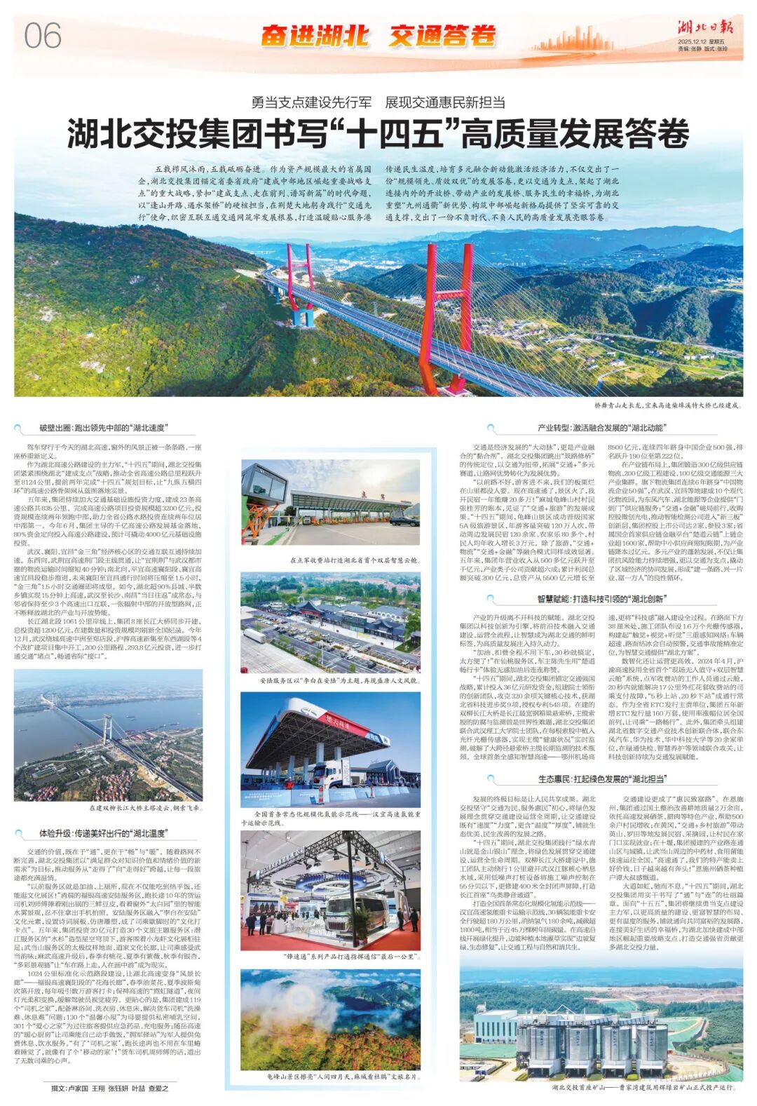 大道如虹,驰而不息。“十四五”期间,湖北交投集团用实干书写了“通”与“连”的壮丽篇章。面向“十五五”,集团将继续勇当支点建设主力军,以更高质量的建设、更富智慧的布局、更有温度的服务,铺就通向共同富裕的发展路、连接美好生活的幸福桥,为湖北加快建成中部地区崛起重要战略支点、打造交通强省贡献更多湖北交投力量。