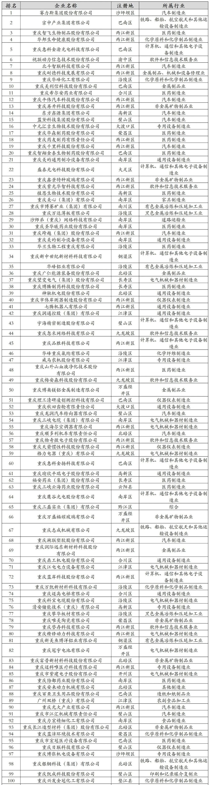 从注册地分布来看,两江新区共有25家企业入选,占比四分之一;其次是南岸区9家,巴南区、涪陵区各有8家,北碚区7家,璧山区6家。沙坪坝区虽然仅有2家企业上榜,但研发费用总额(70.62亿元)、入围企业国内有效发明专利持有量(4700件)在各区县中均排名第一。